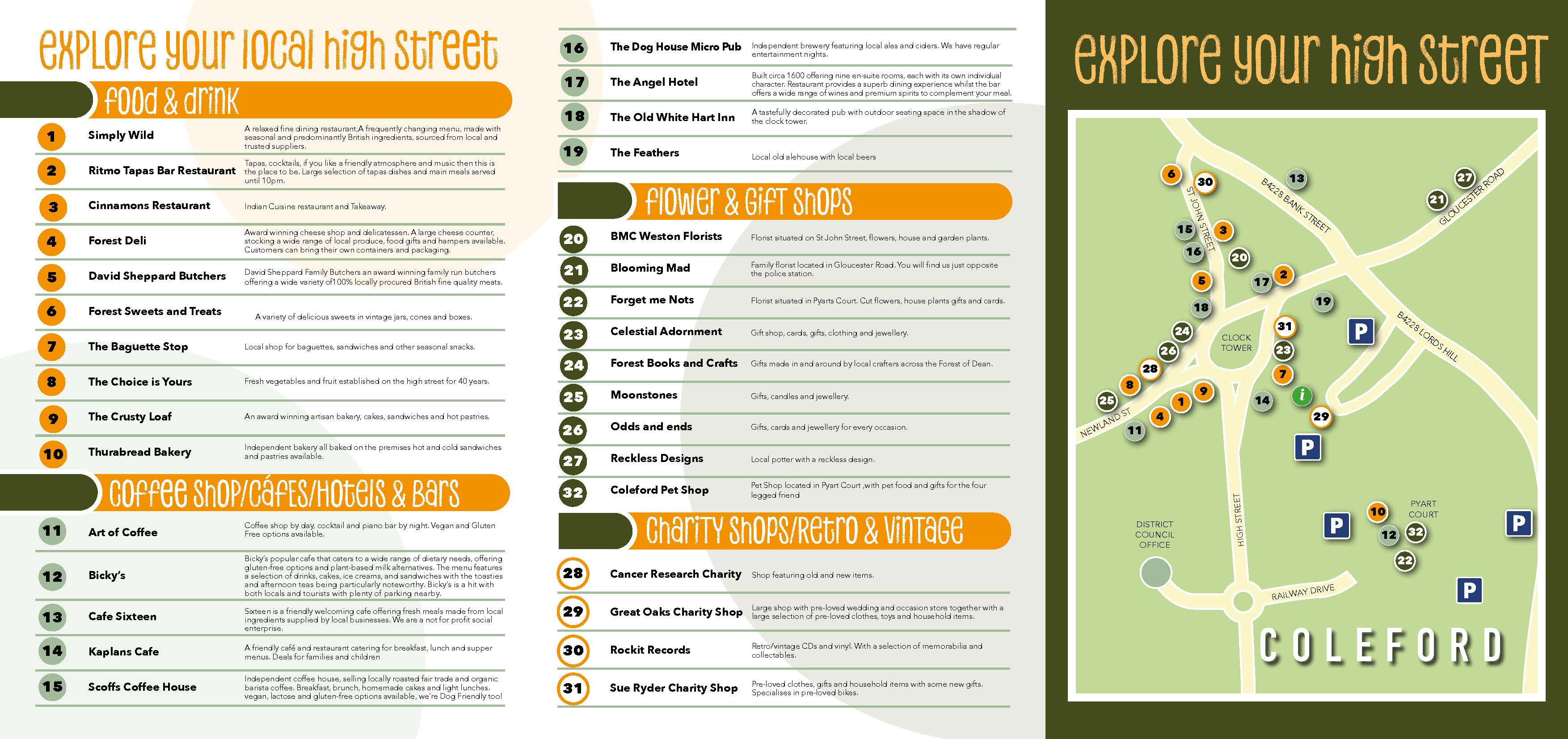 Coleford is a market town with population of approximately 10,500 in the Forest of Dean, Gloucestershire. It is known for its Town Centre Conservation Area, with listed buildings mainly dating from the Georgian Period. Local services include independent shops, tourism businesses, including the Dean and Wye Valley Tourist Information Centre, and a focus in the Market Place for events like the Transport and Music Festivals. The surrounding settlements border the Forest. For more visitor information go to https://colefordtown.net/