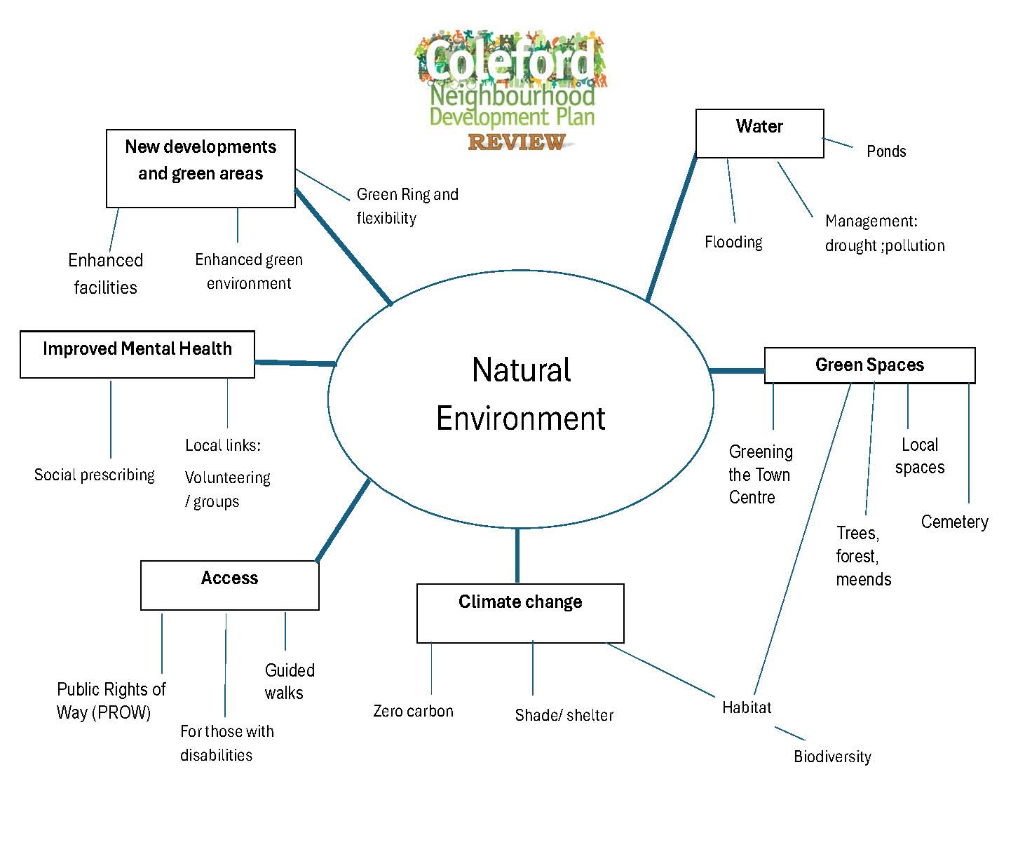 The Natural Environment: Ways to preserve and enhance the Local Green Spaces in the parish, and increase greening in the centre are included in the Regeneration Plan. We need to look at climate change, including water management, further. How can we flex the Green Ring, keep its natural surroundings, and perhaps bring a bit of the Forest into town?