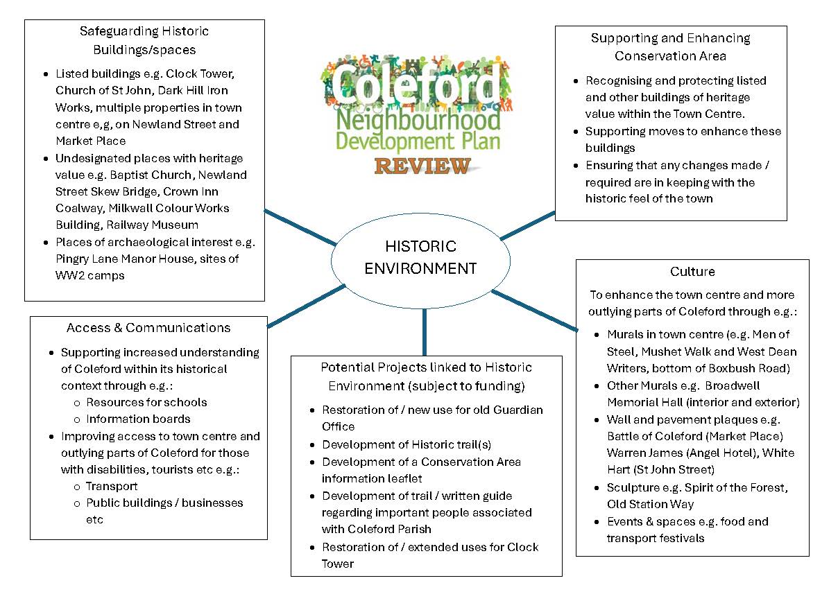 The Historic Environment: Work is underway to identify undesignated buildings and spaces which make Coleford unique. These places are not “Listed” but valued locally and need our protection.